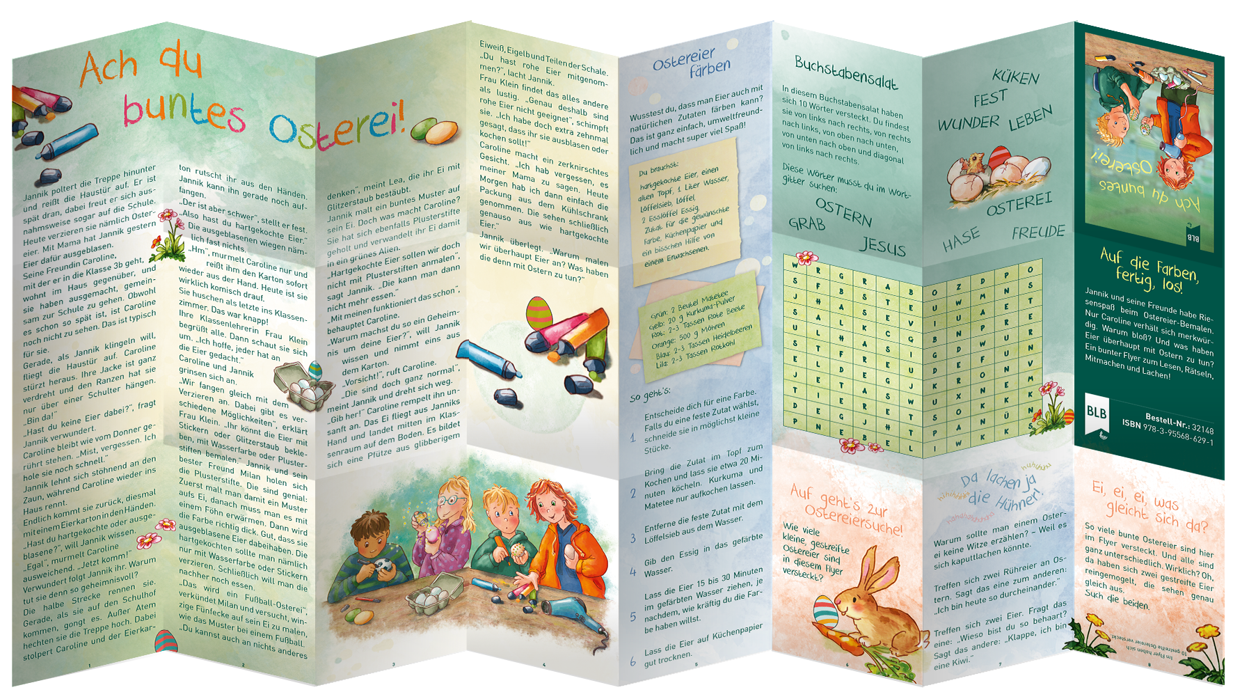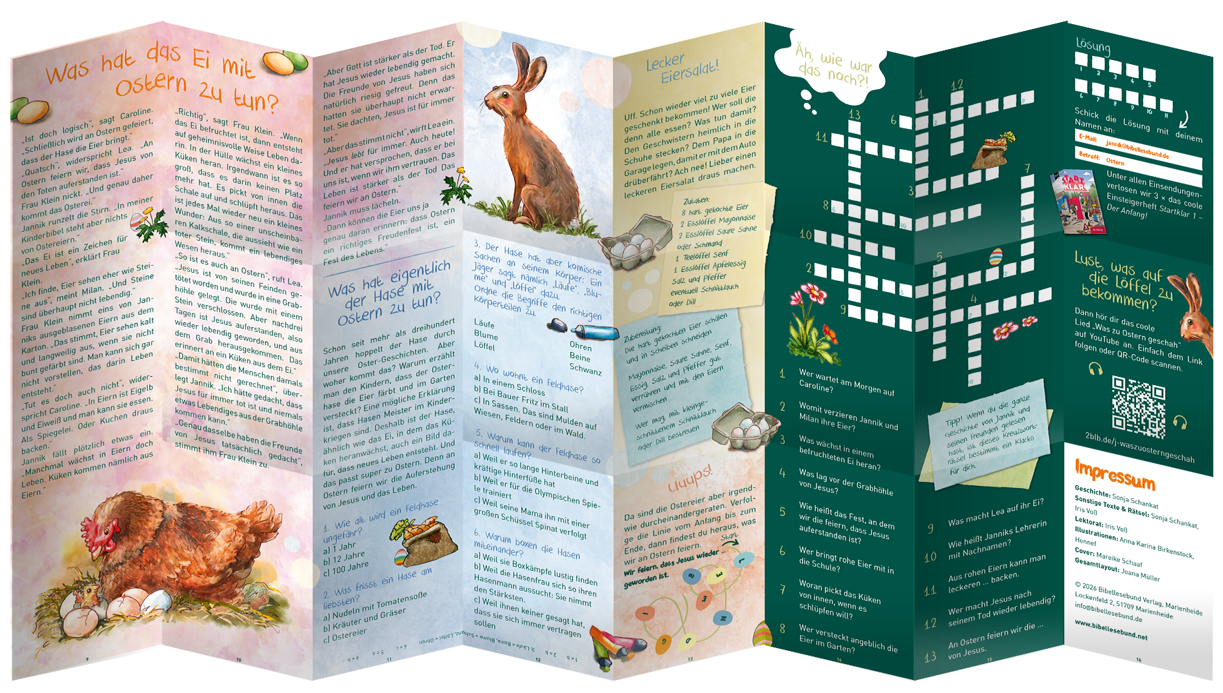 Neben dieser brandneuen Jannik-Geschichte gibt’s im Flyer jede Menge zu entdecken: knifflige Rätsel, kreative Mitmach-Ideen, Witze und eine kindgerechte Erklärung, warum das Ei als Zeichen für neues Leben an die Auferstehung von Jesus erinnert.