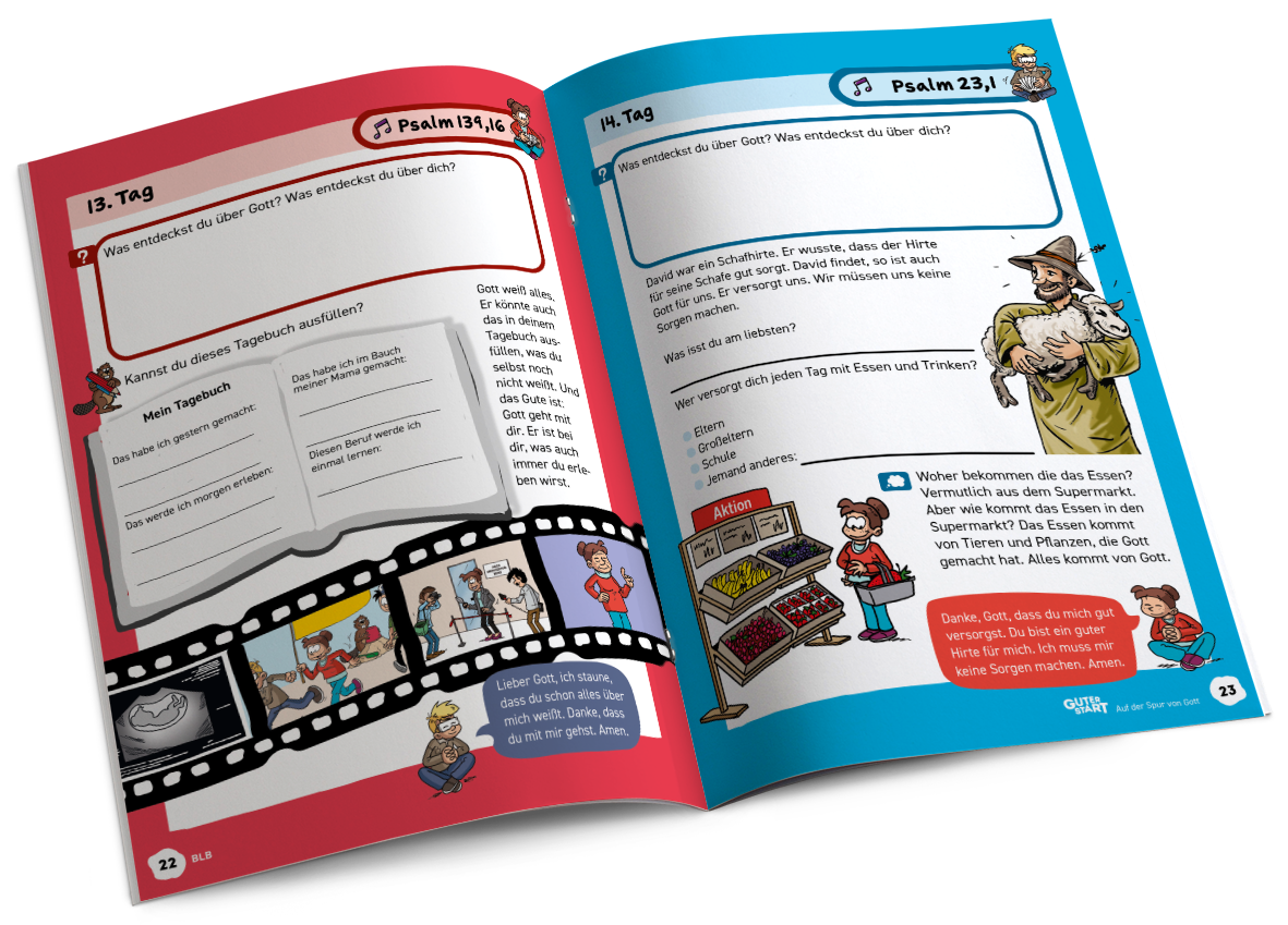 Erste Schritte mit der Bibel für Leseanfänger in 50 Lektionen. Mit Jule, Ole, Sammy und dem Biber Barti begeben sich die Erstleser auf die Spur von Gott. Leicht verständliche Bibelstellen, die alle in der Einsteigerbibel zu finden sind, große Bilder, einfache Erklärungen und vielen Möglichkeiten zur kreativen Beteiligung helfen ihnen, jeden Tag eine Entdeckung in der Bibel über den großen Gott zu machen.