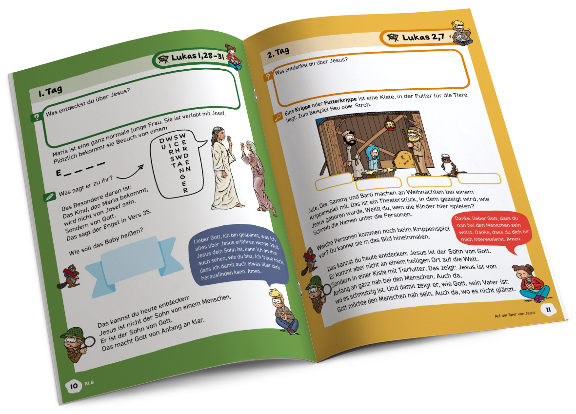 Erste Schritte mit der Bibel für Leseanfänger in 50 Lektionen. Mit Jule, Ole, Sammy und dem Biber Barti begeben sich die Erstleser auf die Spur von Jesus. Leicht verständliche Bibelstellen, die alle in der Einsteigerbibel zu finden sind, große Bilder, einfache Erklärungen und vielen Möglichkeiten zur kreativen Beteiligung helfen ihnen, jeden Tag eine Entdeckung in der Bibel über den Sohn von Gott zu machen.