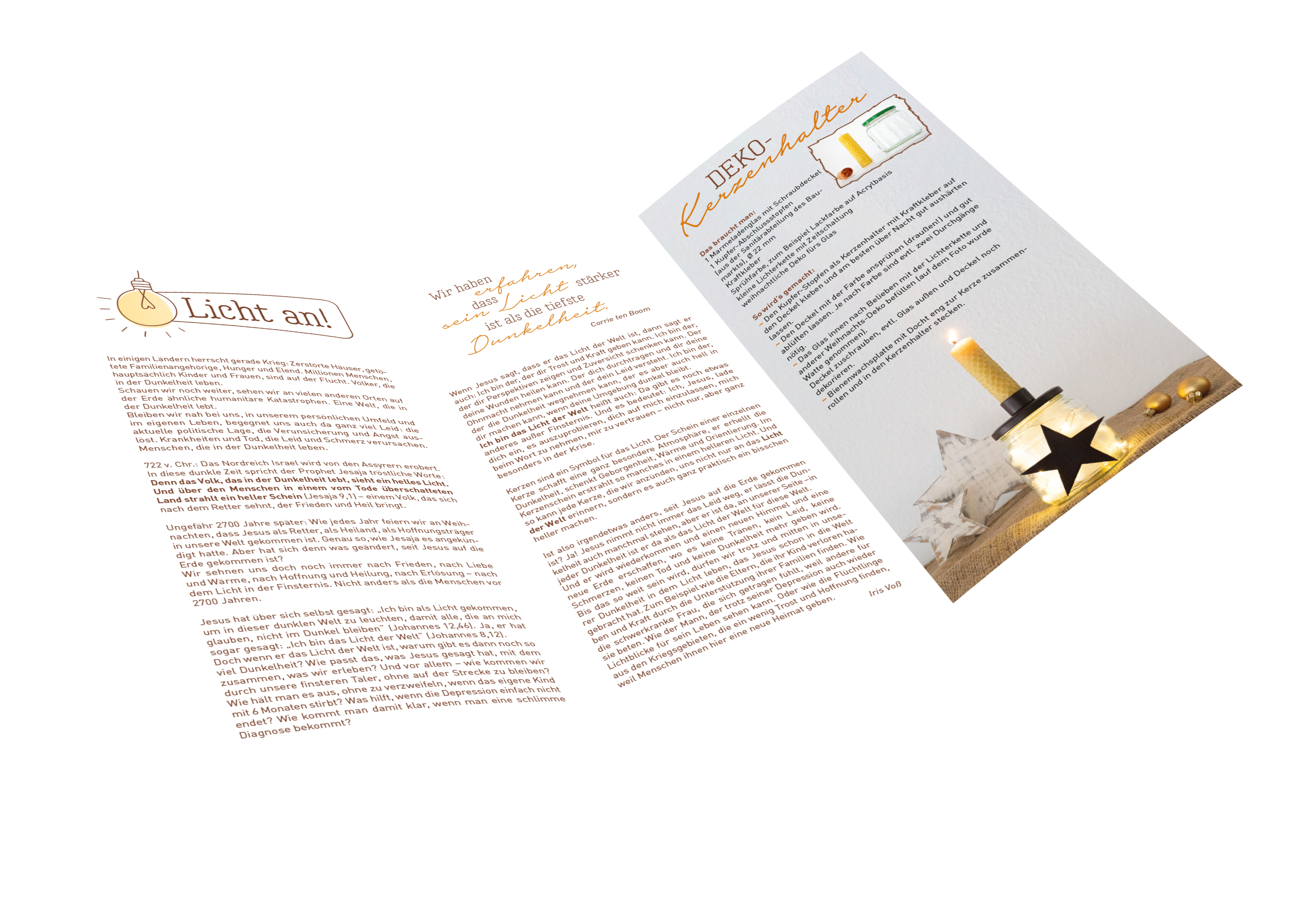 Liebevoll gestaltete Faltkarte mit Geschichten und Gedanken zu Weihnachten. Eine unaufdringliche Einladung für Verwandte, Freunde, Nachbarn, Kollegen oder die ganze Gemeinde, sich auf besondere Weise der Weihnachtsbotschaft zu nähern.