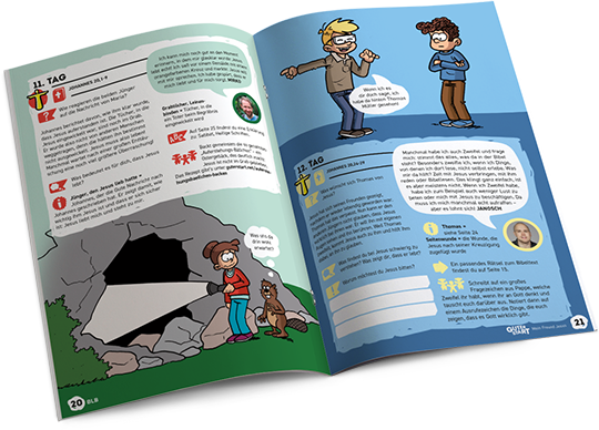 Ergänzt wird das Heft durch bunte Comicbilder, Erlebnisberichte der Autoren, Fragen als Gesprächsimpulse, Worterklärungen, Gebetsvorschläge und optionale praktische Gruppenimpulse.